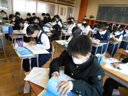 国語の授業では、「朝のリレー」という詩の特徴を考えるために、出てくる地名を地図帳で調べることから始めました。