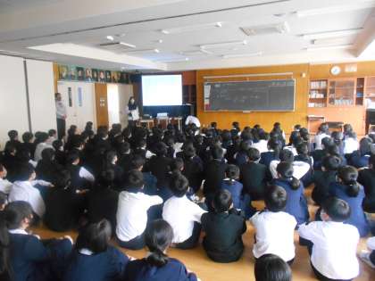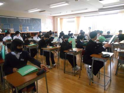 中学校最初の「総合的な学習の時間」は、学年そろって担当の矢郷先生から、オリエンテーションを受けた後、教室で「総合ファイル」を作成しました。今年度の「総合」の時間のテーマは、「様々な年代の職業の人々とのかかわりを通して、自分自身を見つめよう。」です。一人一人が、働くことがどのようなことなのか、自分がどんな人間なのか、社会で求められる力はどのような力なのかを理解し、自分の将来について考えを深められる1年間の学習にしたいと思います。