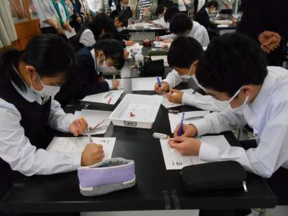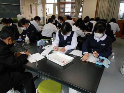 理科の授業では、花のつくりをルーペを使って調べ、どの部分が実や種子になるのかを根拠をもって発表できるように取り組みました。