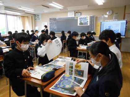 美術の授業では、ゴッホは北斎の作品のどんなところがよいと思ったのか、グループごとに意見を出し合って考えました。