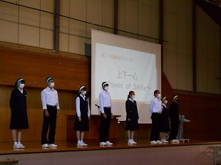 今年度の運動会スローガンは、「上下一心(しょうかいっしん)〜Power of Smile〜」。運動会実行委員長から、みんなの心を一つにして運動会を成功させようという思いを込められていることが全校生徒に伝えられました。各団の団長から意気込みが語られた後、校長先生から団長に団旗が授与されました。