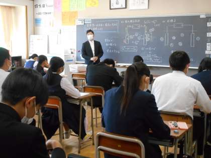 理科の授業では、電解質の水溶液に電流が流れる様子を説明することに取り組みました。
