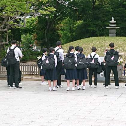 平和記念公園で、各クラス3グループに分かれて碑巡りを行っています。ガイドさんに説明をしていただきながら、戦争当時の辛い歴史を学んでいます。