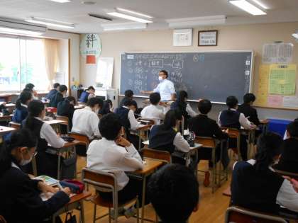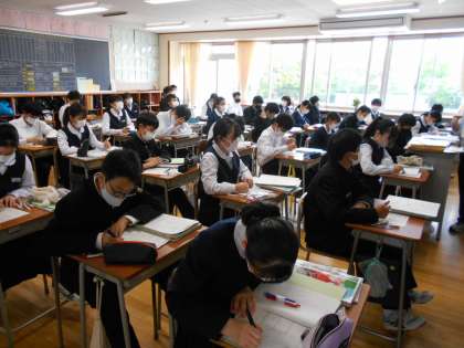 理科の授業風景です。「化学反応式をつくれるようになろう」という学習課題で、反応式のつくりかたのポイントについて確認しました。先生の話を聞き漏らさないように集中している様子が伝わってきました。