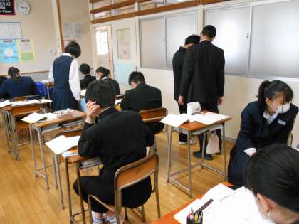 数学科の授業風景です。「式を変形してある文字について解こう」という学習課題で、計算問題に取り組ました。分からない問題を質問したり、教え合ったりする場面では、相手の困っているところを聞きながら、解き方の手順を丁寧に一緒に確認してあげている姿が印象的でした。