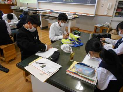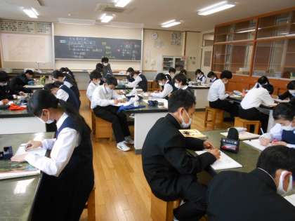美術科の授業風景です。美術室は静寂につつまれ、真剣な表情でスケッチをしている生徒の姿がありました。先生からは「大切にしたいポイントを考えて描こう」とアドバイスがあり、部活動で使うシューズやラケット、お気に入りの文房具等、それぞれが選んだ物をじっくりと観察しながら描いていました。