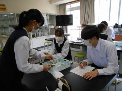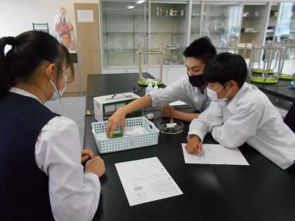 理科の授業では、酸性、アルカリ性を示すものの正体について実験を通して考えました。