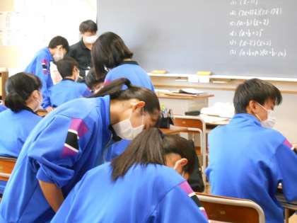 数学の授業では、多項式の計算問題に取り組み、分からないところは教え合いをしました。仲間の言葉で教えてもらうと、理解しやすいようです。