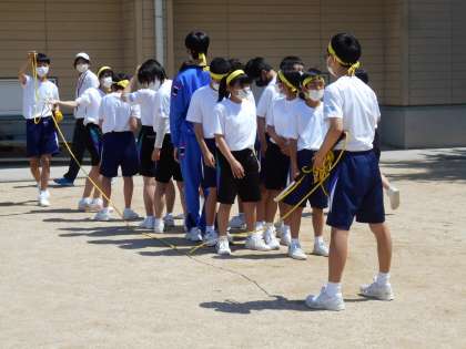 大縄跳びでは、連続して10回以上飛べるようになった団もありました。縄を回す2人の技術も大切ですが、何よりみんなの息を合わせることです。当日頑張ってください。