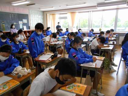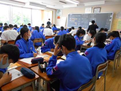 数学の授業は、教育実習の先生との最後の授業でした。等式の性質を利用して連立方程式を解けるように、グループ活動を取り入れながら進められました。