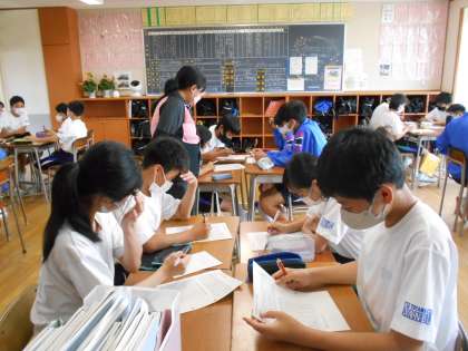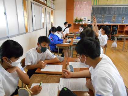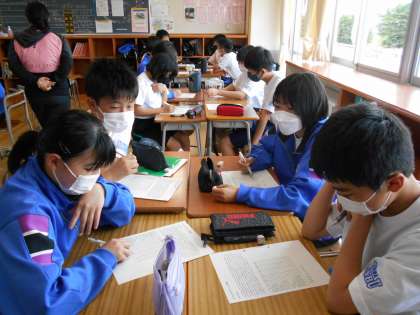 学活の時間に、コンセンサスゲームに取り組んだクラスもありました。このゲームには、「人の発言を否定しない」というルールがあります。砂漠で遭難したら、生き残るために何が必要か、リストの中から2つ品物を選び、その理由をルールを守って聞き合い、グループごとに意見をまとめました。