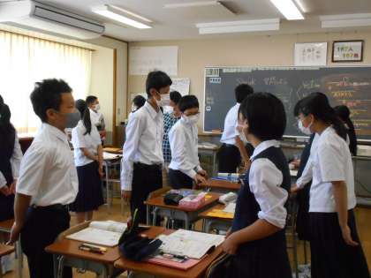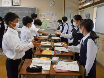 英語の授業では、中間評価前の復習として、Are you〜?、Do you〜?、Can you〜?の3つの問答をペアで練習しました。
