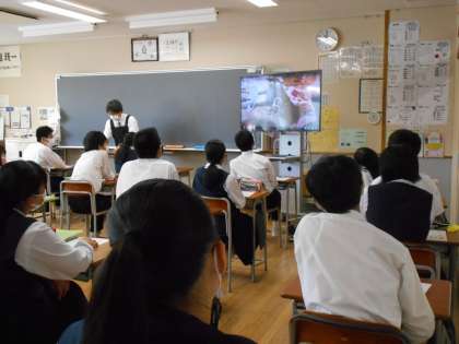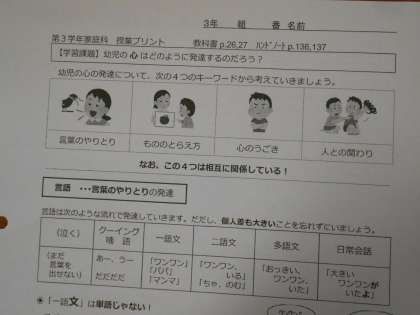 家庭科の授業では、「幼児の心はどのように発達するのだろうか」という学習課題に取り組んでおり、幼児の映像等を見ながら考えました。