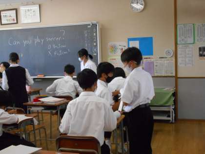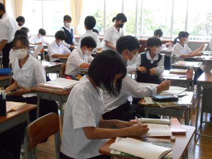英語の授業では、テストの復習の後、提出物の確認等がありました。ワーク等での復習は、成果につながっていることと思います。