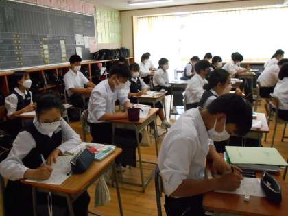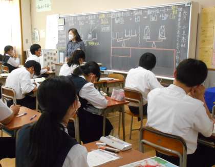 理科の授業では、硫酸+塩化バリウム、炭酸水素ナトリウム+塩化水素の化学式を作りながら、実験のまとめをしました。