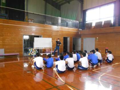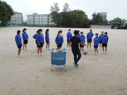保健体育の授業では、男子はバレーボールで一人3段階攻撃を目標に取り組みます。女子はサッカーです。それぞれ基本的な技術を身に付けることからスタートです。
