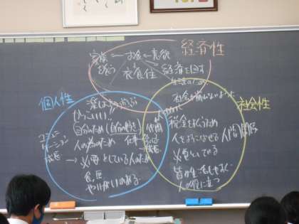 本日の総合的な学習の時間から、「社会人基礎力講座」を始めました。第1回のテーマは、「働く意味」です。自分が何のために働くのかを友達と意見交換した後に、職業選択には、生計を立てることを重要視する「経済性」と社会に貢献することを重要視する「社会性」と自分個人の目的や生きがいを充足させることを重要視する「個人性」の3要素があることを確認しました。