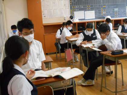 英語の授業では、現在完了の完了を表現を使って、ペアで問答できるように、問いの文を考えたり、問答したりしました。
