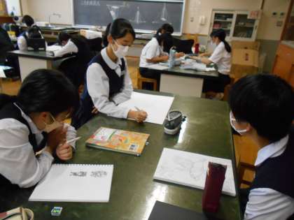美術部の制作の様子です。いずれ青少年美術展に応募したり、文化活動発表会で展示したりする予定です。