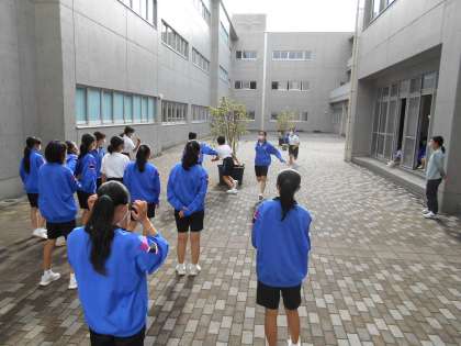 バドミントン部の様子です。今日、コートを使えない女子は、中庭を使ってトレーニングを行い増しtら。