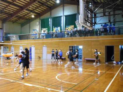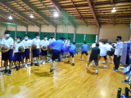バスケットボール部は、女子がコートを使い、男子がピロティーでドリブルの練習をしているところでした。