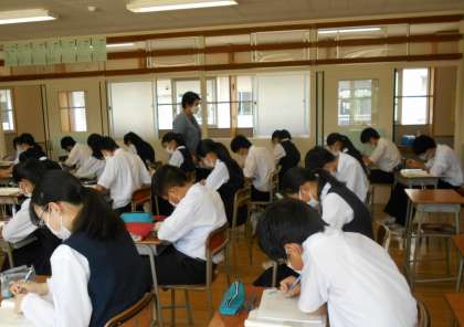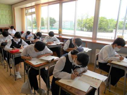 国語の授業では、教材「クマゼミ増加の原因を探る」に出てくる語句の意味調べをしていました。