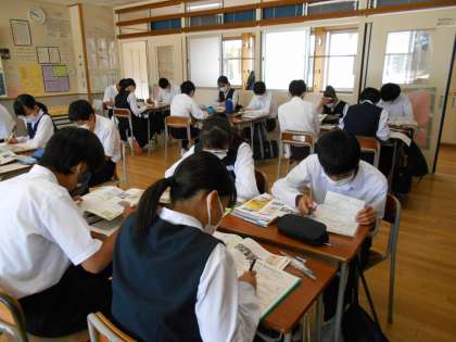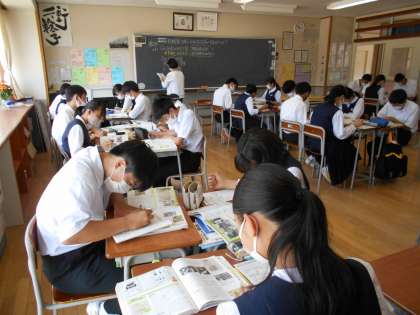 社会の授業では、敗戦後、日本でどのような改革が行われたのか、ワークシートの問題をグループで解きながら勉強しました。