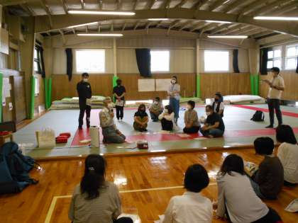 富山市消防局および富山方面団西田地方分団より5名の講師をお迎えして、救命救急講習会を行いました。保護者、教員、生徒合わせて25名の参加がありました。参加者は、胸骨圧迫や、AEDを使った救急蘇生法を体験したり、止血法について説明を受けたりして、救命のために必要な行動を確認することができました。