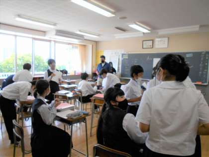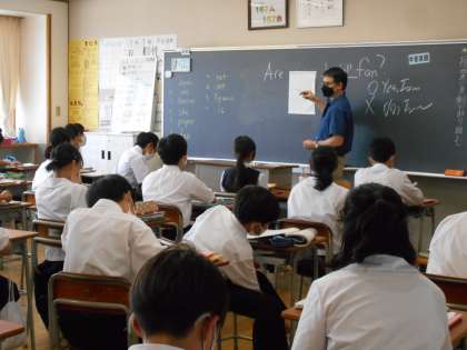英語の授業では、ALTの先生と一緒に、「Are you〜?」を使った問答で得た情報を、He、Sheを使って表現することに取り組みました。