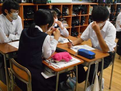 今日のNewspaperで学び愛の記事も、文化委員のメンバーで選んでくれました。今日は、コロナ禍でのマスク着用に関する記事について考えたことを話し合いました。「マスクを着用すると○○だし、着用しないと○○だし・・・」などど、マスク着用のメリットとデメリットを比較して考えている班もありました。