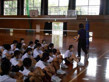 女子保健体育の授業では、バレーボールに取り組みました。まず、全体でルールやローテンションの仕方等を確認してから始めました。