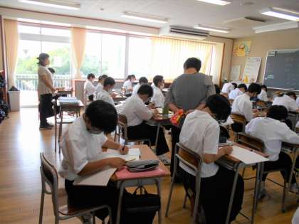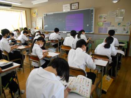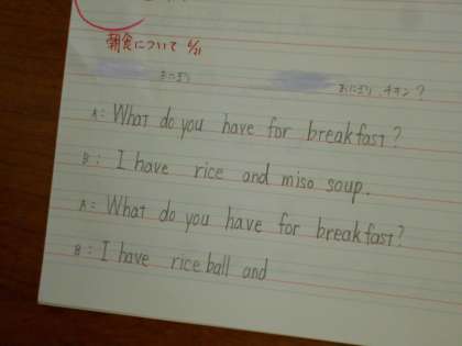 英語の授業では、「What do you have for breakfast?」という疑問文を使って、朝食についての対話練習や対話文を書くことに取り組みました。