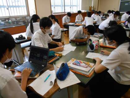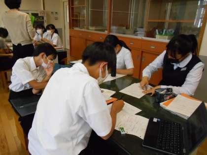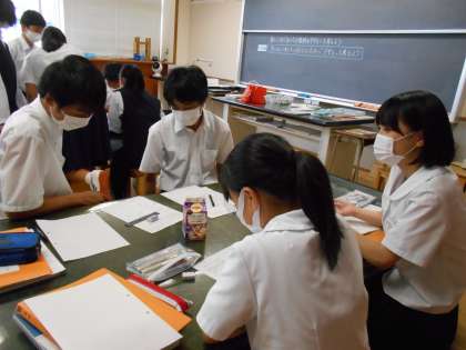 美術の授業では、富山の特産物を生かした飲み物の新しいパッケージを考えています。なしやホタルイカという題材もあれば、牛乳と富山でつくる学習ノートの表紙をコラボさせるアイディアもありました。