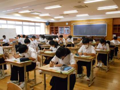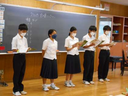 音楽の授業では、クラス内合唱コンクールということで、班ごとに前に出て発表をしました。
