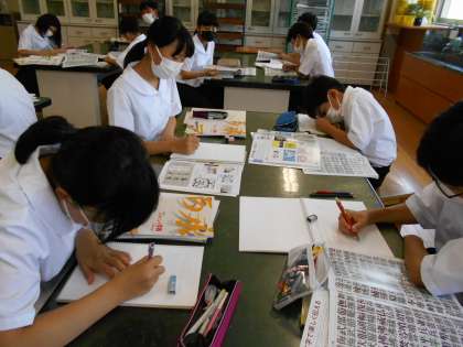 美術の授業では、漢字の意味を楽しく伝える文字のデザインを考えていました。雨の一部を水滴で表すなど面白いものがたくさんありました。