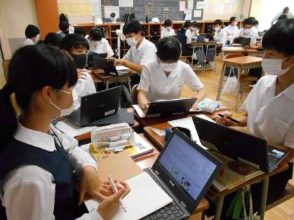 社会の授業では、「50年後の未来に伝えたい!『現代』を教科書にしよう。」という課題に向けて題材を一人一人決め、情報収集から始めました。