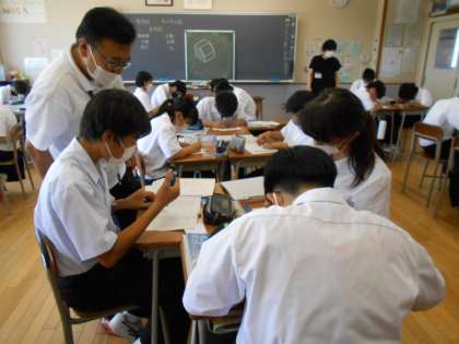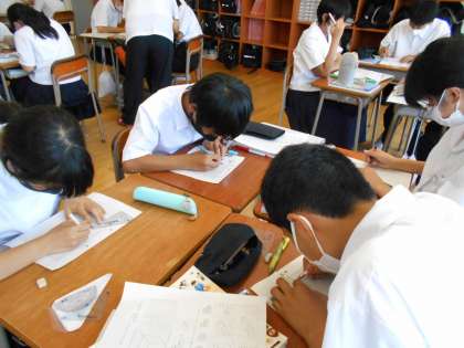 技術の授業では、等角図やキャビネット図を描く練習をしました。線を引くにも順番があるらしく、確かめながら進めていました。
