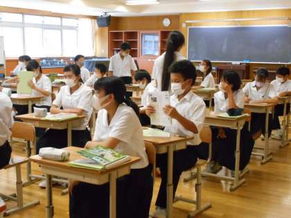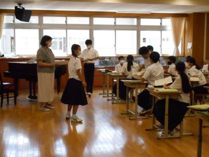 音楽の授業では、クラス内合唱コンクールをしました。終了後は、互いに評価したワークシートを提出しました。