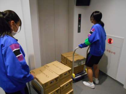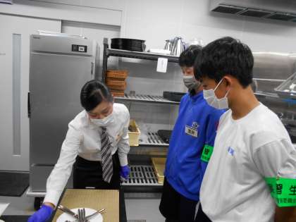 客室の清掃では、客室1部屋ずつに飲料水を運んでいました。レストランの厨房では、食事のテーブルマナーについて説明を受けていました。最終日には実際に表へでて食事を運ぶ予定です。