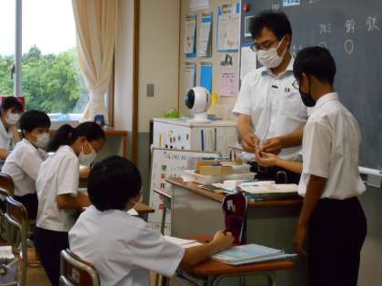 理科の授業では、金属と非金属を見極めるミニ実験を行いました。みんな興味津々で注目していました。