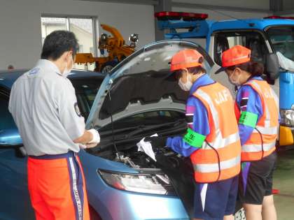 車の安全点検を行いました。ドライバーが安全運転できるように、エンジンオイルやバッテリーの異常の有無を確かめました。