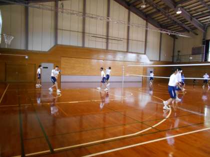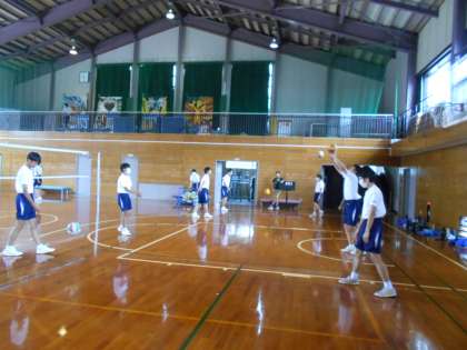 男子保健体育の授業ではバレーボールに取り組んでおり、ペアでトスの練習をしていました。