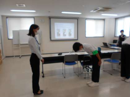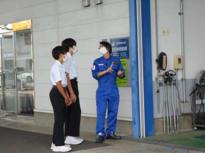 今日が初日ということもあり、まず接客のマナーやあいさつの練習をしました。おじぎの仕方等、細部にわたって意識していました。また、整備工場を見学しました。機会や工具の使い方の説明を真剣に聞いていました。