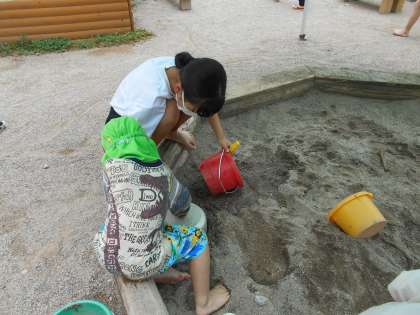園庭でままごとや水鉄砲などをして遊んでいました。また、遊ぶだけでなく園児の着替えを手伝ったり、窓ふきをしたり真剣に活動していました。