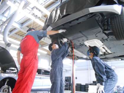 自動車の点検作業を行いました。オイル交換やブレーキパッドの点検、空気圧調べを体験することができました。
