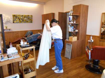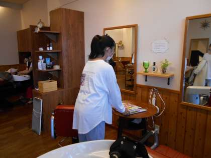 お客様がいらしたら、雑誌をお渡ししたり、飲み物をお出ししたりしていました。切った髪の毛の掃除も行いました。「マネキンにパーマをかけさせてもらったり、ヘアアレンジを教えてもらったりすることができて、うれしかった」と話していました。