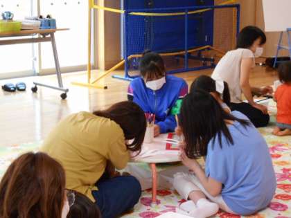 最終日の今日は、親子サークルに参加しました。お母さんや子供達と一緒に工作をし、作ったおもちゃで遊びました。