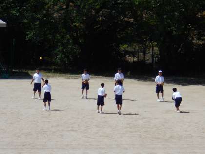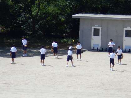 男子保健体育の授業では、ソフトボールに取り組みました。暑い時期ですから、帽子の着用を許可しています。遠慮せずに使用しましょう。