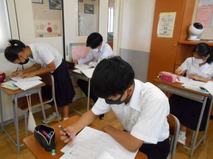数学の授業では、確かめの時間に、じっくり自分で考えている人もおれば、考え方の確認を互いにしている人もいました。