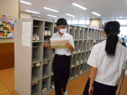 規律委員会による、下足の整頓チェックを行っていました。かかとをそろえて下足を入れるためには、心にちょっとしたゆとりが生まれる登校スタイル、つまり、余裕をもって登校することも大切です。駆け込み登校にならないようにしましょう。